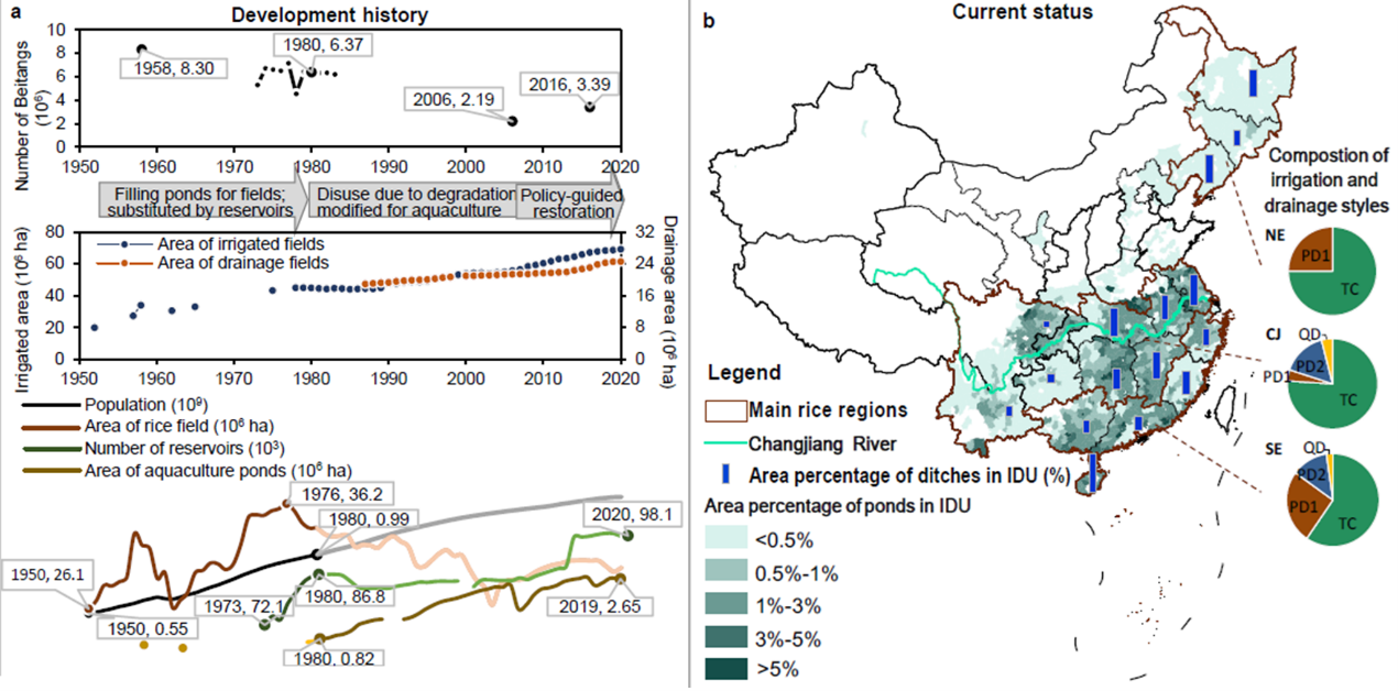 PA真人视讯杜耘、张亮团队,与中国农科院、华中农业大学、中科院重庆绿色智能研究院、加拿大滑铁卢大学及湖北、江西、辽宁省农科院等单位合作,系统调查了我国水稻灌排系统的开展历程及小水体利用现状,发现近几十年来由于填塘造田和自然损毁,我国稻区的水塘数量已大幅减少,现存水塘有的缺乏维护而淤积严重、有的改为精养渔塘,80%都不再参与水稻灌排(图1)。然而,基于前期建立的涵盖中国417个水体的数据集,团队发现相比于湖泊、水库等大型水体,小水体的氮磷截留能力更强。稻区小水体的减少和弃用,增加了水稻生产的清水消耗量和污水排放量,从而提高了水稻生产的水足迹。同时,过度依赖远距离水源的灌溉模式,也增加了稻田在干旱天气的减产风险。