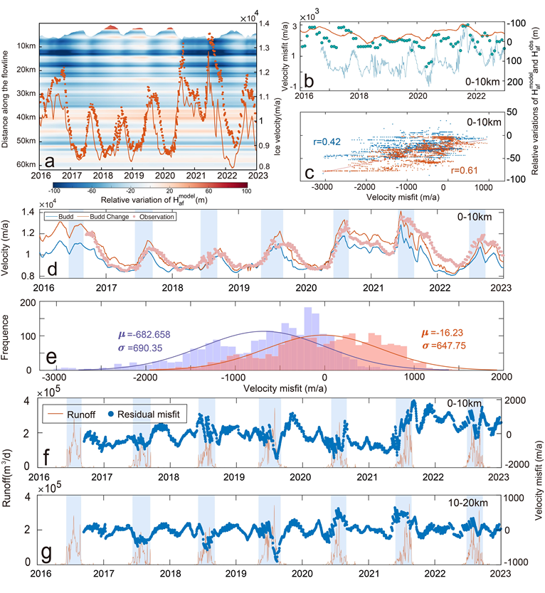 a-c展示了Haf变化与冰流速的对比,图d-e展示了将Haf变化纳入模型后的结果变化