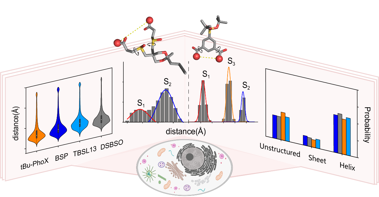 蛋白质结构及其动态变化是分析其生物功能的核心。现在实验研究主要局限于解析体外的纯化蛋白,而AlphaFold等结构预测方法只能预测蛋白质的静态结构,难以反映蛋白质在细胞内的结构和动态变化。原位化学交联质谱作为一项新兴技术,能够在细胞环境下研究蛋白质的结构、动态及其相互作用。然而,不同交联剂的结构特性如何影响其在细胞内捕获蛋白动态信息的能力,长期以来缺乏系统性的认识。